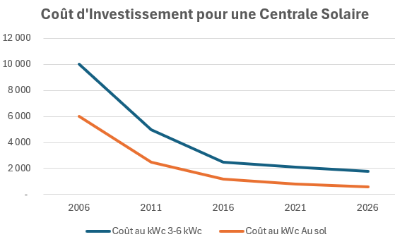 - La chute des prix des modules : En 2010, un module coûtait environ 2 €/Wc, contre seulement 0,10 € à 0,15 €/Wc en 2026.
